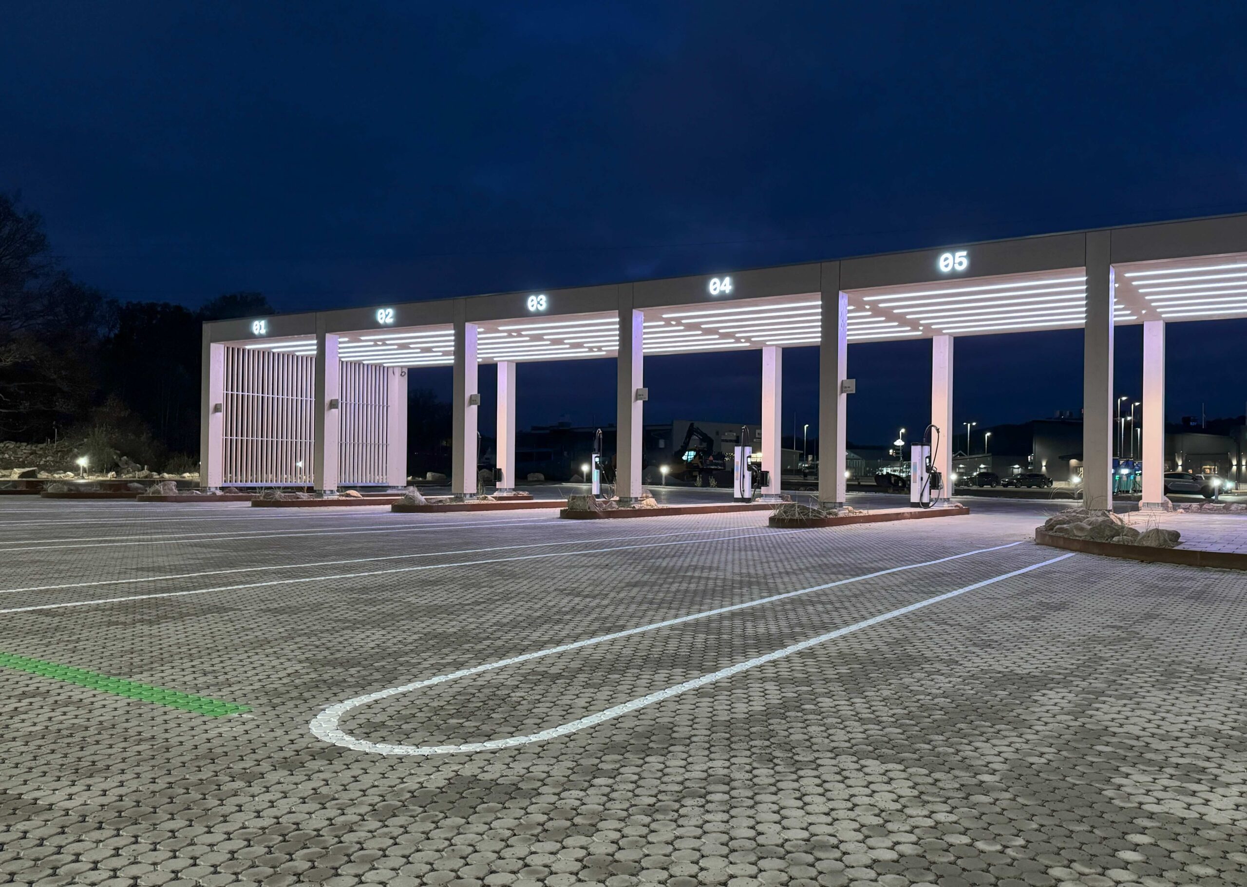 The innovative approach to charging stations has been developed by Einride; a technology company focused on sustainable logistic solutions. The network of stations has been purposefully designed with a strong investment in energetic lighting design. The aim is to make the stations easily identifiable and locatable even in the darker hours. Adding to this, the lighting makes the experience of charging heavy vehicles more enjoyable and engaging.